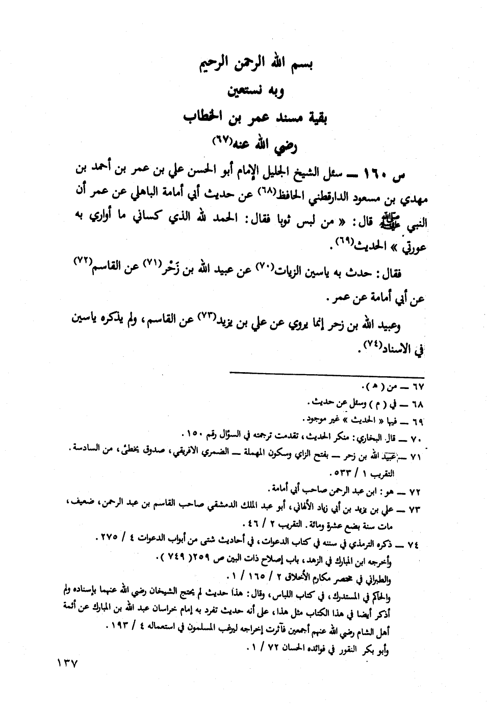 160- سُئِلَ الشَّيْخُ الْجَلِيلُ الْإِمَامُ أَبُو الْحَسَنِ عَلِيُّ بْنُ عُمَرَ بْنِ أَحْمَدَ بْنِ مَهْدِيِّ بْنِ مَسْعُودٍ الدَّارَقُطْنِيُّ الْحَافِظُ، عَنْ حَدِيثِ أَبِي أُمَامَةَ الْبَاهِلِيِّ، عَنْ عُمَرَ، أَنّ النَّبِيَّ صَلَّى اللَّهُ عَلَيْهِ وَسَلَّمَ قَالَ: مَنْ لَبِسَ ثَوْبًا، فَقَالَ: الْحَمْدُ لِلَّهِ الَّذِي كَسَانِي مَا أُوَارِي بِهِ عَوْرَتِي ... الْحَدِيثَ.
