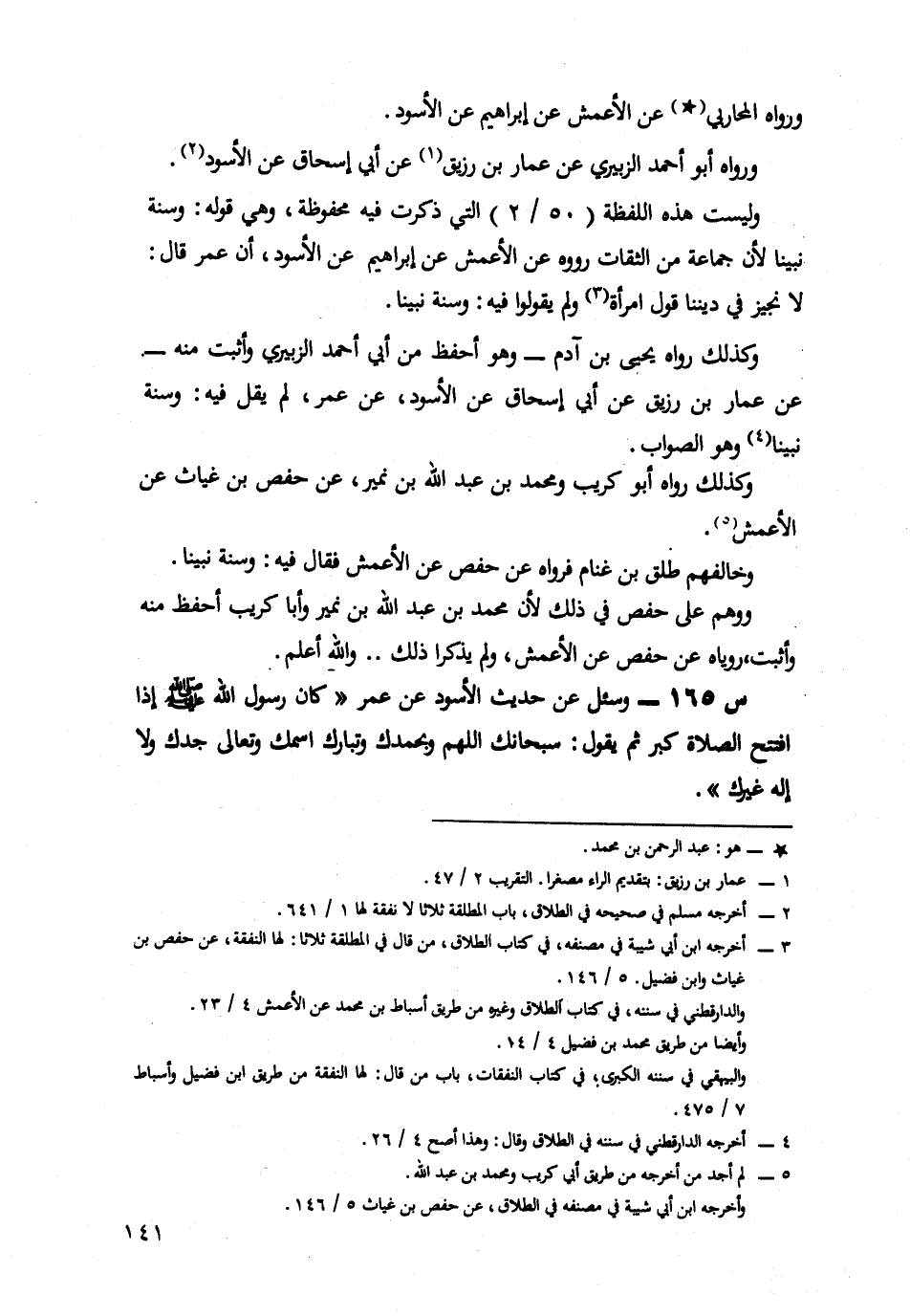 وَخَالَفَهُمْ طَلْقُ بْنُ غَنَّامٍ فَرَوَاهُ عَنْ حَفْصٍ، عَنِ الْأَعْمَشِ فَقَالَ فِيهِ وَسُنَّةُ نَبِيِّنَا وَوَهِمَ عَلَى حَفْصٍ فِي ذَلِكَ لِأَنَّ مُحَمَّدَ بْنَ عَبْدِ اللَّهِ بْنِ نُمَيْرٍ وَأَبَا كُرَيْبٍ أَحْفَظَ مِنْهُ وَأَثْبَتَ رَوَيَاهُ عَنْ حَفْصٍ، عَنِ الْأَعْمَشِ وَلَمْ يَذْكُرَا ذَلِكَ وَاللَّهُ أَعْلَمُ.