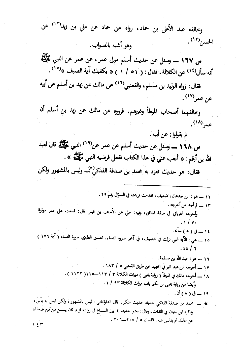 167- وَسُئِلَ عَنْ حَدِيثِ أَسْلَمَ مَوْلَى عُمَرَ، عَنْ عُمَرَ، عَنِ النَّبِيِّ صَلَّى اللَّهُ عَلَيْهِ وَسَلَّمَ؛ أَنَّهُ سَأَلَ عَنِ الْكَلَالَةِ، فَقَالَ: يَكْفِيكَ آيَةَ الصَّيْفِ.