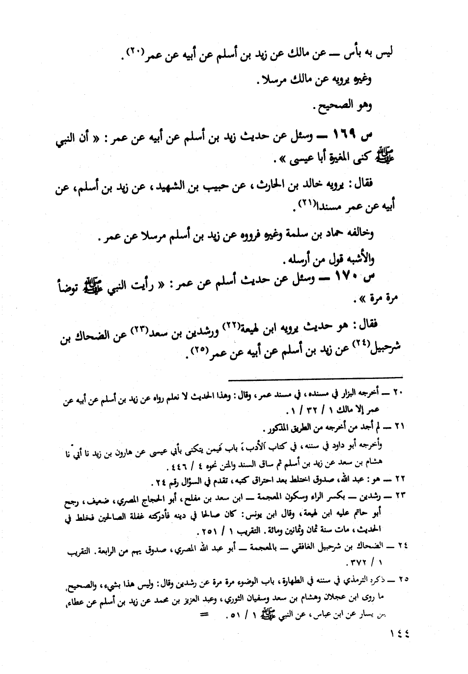 170- وَسُئِلَ عَنْ حَدِيثِ أَسْلَمَ، عَنْ عُمَرَ رَأَيْتُ النَّبِيَّ صَلَّى اللَّهُ عَلَيْهِ وَسَلَّمَ تَوَضَّأَ مَرَّةً مَرَّةً.