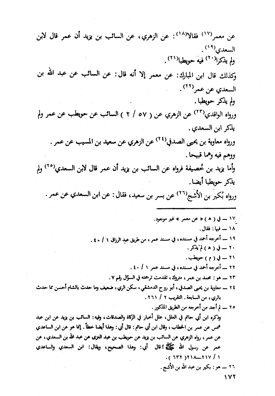 وَرَوَاهُ الْوَاقِدِيُّ، عَنِ الزُّهْرِيِّ، عَنِ السَّائِبِ، عَنْ حُوَيْطِبٍ، عَنْ عُمَرَ، وَلَمْ يَذْكُرِ ابْنَ السَّعْدِيِّ.
