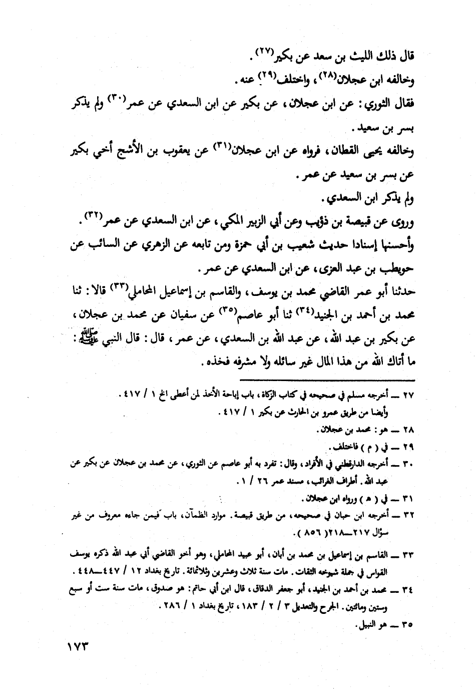 فَقَالَ الثَّوْرِيُّ: عَنِ ابْنِ عَجْلَانَ، عَنْ بُكَيْرٍ، عَنِ ابْنِ السَّعْدِيِّ، عَنْ عُمَرَ، وَلَمْ يَذْكُرْ بُسْرَ بْنَ سَعِيدٍ.