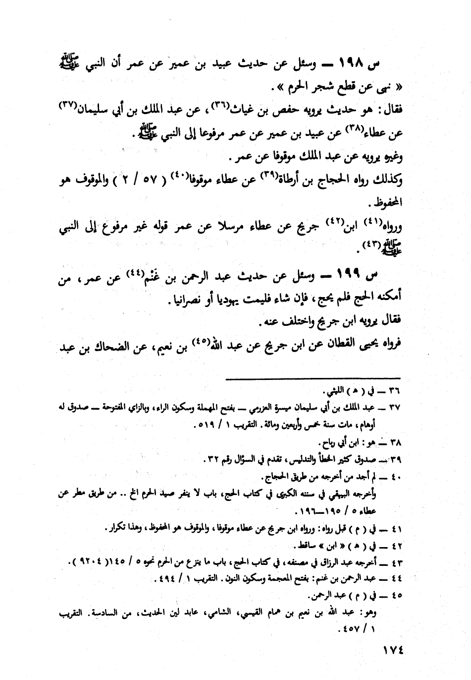 198- وَسُئِلَ عَنْ حَدِيثِ عُبَيْدِ بْنِ عُمَيْرٍ، عَنْ عُمَرَ أَنَّ النَّبِيَّ صَلَّى اللَّهُ عَلَيْهِ وَسَلَّمَ نَهَى عَنْ قَطْعِ شَجَرِ الْحَرَمِ.