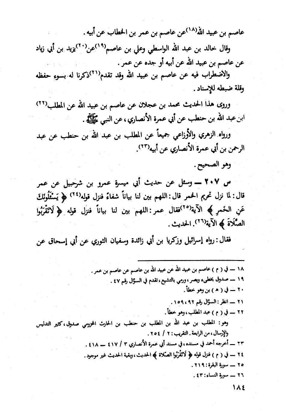 207- وَسُئِلَ عَنْ حَدِيثِ أَبِي مَيْسَرَةَ عَمْرِو بْنِ شُرَحْبِيلَ، عَنْ عُمَرَ قَالَ لَمَّا نَزَلَ تَحْرِيمُ الْخَمْرِ قَالَ اللَّهُمَّ بَيِّنْ لَنَا بَيَانًا شِفَاءً فنزل قوله {يسئلونك عن الخمر} الْآيَةَ فَقَالَ عُمَرُ اللَّهُمَّ بَيِّنْ لَنَا بَيَانًا فنزل قوله {لا تقربوا الصلاة} الْآيَةَ الْحَدِيثَ.