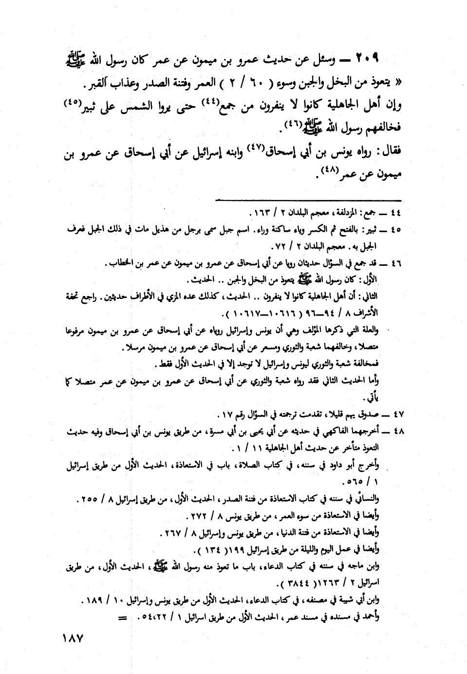 209- وَسُئِلَ عَنْ حَدِيثِ عَمْرِو بْنِ مَيْمُونٍ، عَنْ عُمَرَ كَانَ رَسُولُ اللَّهِ صَلَّى اللَّهُ عَلَيْهِ وَسَلَّمَ يَتَعَوَّذُ مِنَ الْبُخْلِ، وَالْجُبْنِ، وَسُوءِ الْعُمْرِ، وَفِتْنَةِ الصَّدْرِ، وَعَذَابِ الْقَبْرِ.