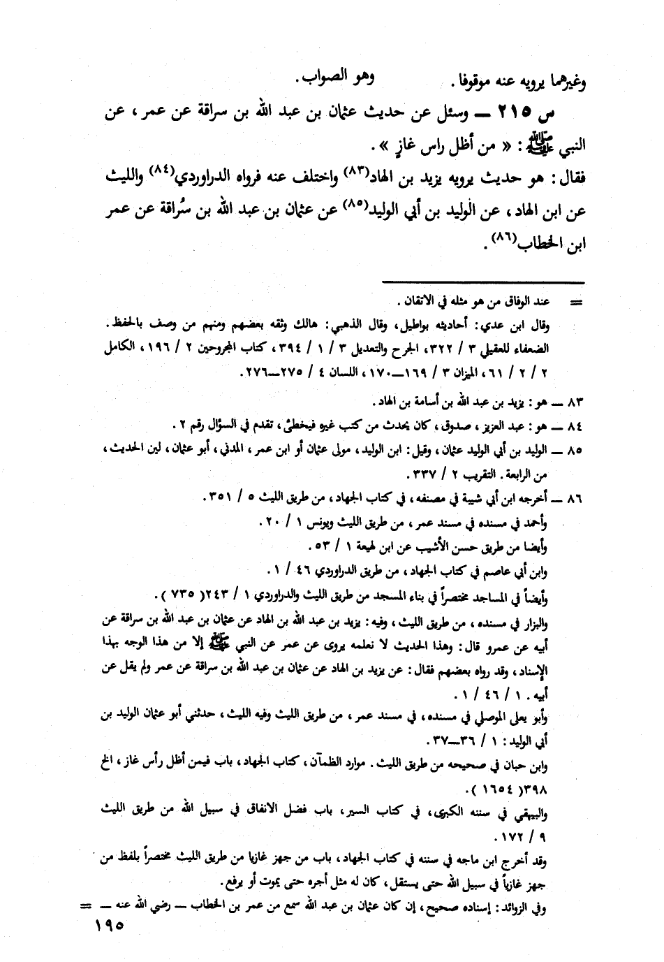 215- وَسُئِلَ عَنْ حَدِيثِ عُثْمَانَ بْنِ عَبْدِ اللَّهِ بْنِ سُرَاقَةَ، عَنْ عُمَرَ، عَنِ النَّبِيِّ صَلَّى اللَّهُ عَلَيْهِ وَسَلَّمَ: مَنْ أَظَلَّ رَاْسَ غَازٍ.