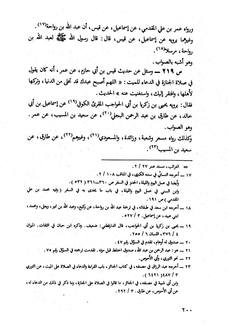 219- وَسُئِلَ عَنْ حَدِيثِ قَيْسِ بْنِ أَبِي حَازِمٍ، عَنْ عُمَرَ أَنَّهُ كَانَ يَقُولُ فِي صَلَاةِ الْجِنَازَةِ فِي الدُّعَاءِ لِلْمَيِّتِ: اللَّهُمَّ أَصْبَحَ عَبْدُكَ قَدْ تَخَلَّى مِنَ الدُّنْيَا، وَتَرَكَهَا لِأَهْلِهَا، وَافْتَقَرَ إِلَيْكَ، وَاسْتَغْنَيْتَ عَنْهُ ... الْحَدِيثَ.