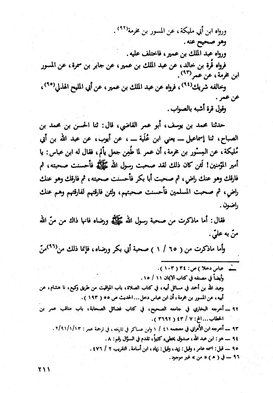 حَدَّثَنَا مُحَمَّدُ بْنُ يُوسُفَ أَبُو عُمَرَ الْقَاضِي، قَالَ: حدثنا الحسن بن محمد بن الصباح حدثنا إِسْمَاعِيلُ، يَعْنِي ابْنَ عُلَيَّةَ عَنْ أَيُّوبَ عَنْ عَبْدِ اللَّهِ بْنِ أَبِي مُلَيْكَةَ عَنِ الْمِسْوَرِ بْنِ مَخْرَمَةَ أَنَّ عُمَرَ لَمَّا طُعِنَ جَعَلَ يَأْلَمُ فَقَالَ لَهُ ابْنُ عَبَّاسٍ يَا أَمِيرَ الْمُؤْمِنِينَ لَئِنْ كَانَ ذَلِكَ لَقَدْ صَحِبْتَ رَسُولَ اللَّهِ صَلَّى اللَّهُ عَلَيْهِ وَسَلَّمَ فَأَحْسَنْتَ صُحْبَتَهُ ثُمَّ فَارَقَكَ وَهُوَ عَنْكَ رَاضٍ ثُمَّ صَحِبْتَ أَبَا بَكْرٍ فَأَحْسَنْتَ صُحْبَتَهُ ثُمَّ فَارَقَكَ وَهُوَ عَنْكَ رَاضٍ ثُمَّ صَحِبْتَ الْمُسْلِمِينَ فَأَحْسَنْتَ صُحْبَتَهُمْ وَلَئِنْ فَارَقْتَهُمْ لَفَارَقْتَهُمْ وَهُمْ عَنْكَ رَاضُونَ.