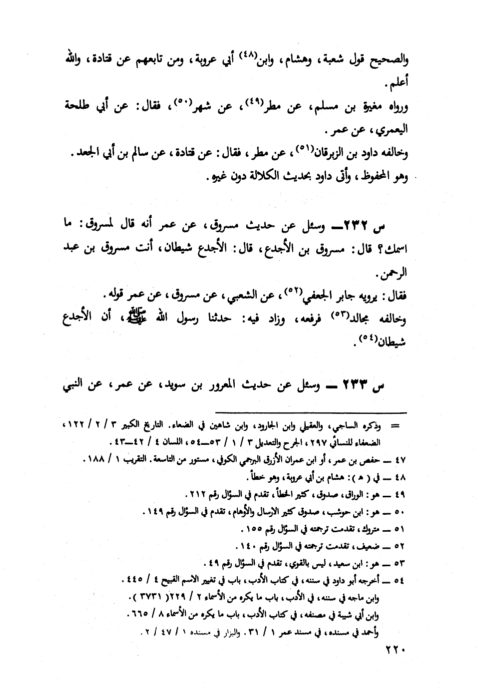 232- وَسُئِلَ عَنْ حَدِيثِ مَسْرُوقٍ، عَنْ عُمَرَ أَنَّهُ قَالَ لِمَسْرُوقٍ مَا اسْمُكَ قَالَ مَسْرُوقُ بْنُ الْأَجْدَعِ قَالَ الْأَجْدَعُ شَيْطَانٌ أَنْتَ مَسْرُوقُ بْنُ عَبْدِ الرَّحْمَنِ.