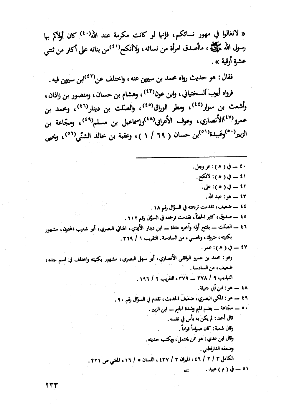 241- وَسُئِلَ عَنْ حَدِيثِ أَبِي الْعَجْفَاءِ السُّلَمِيِّ، عَنْ عُمَرَ، قَالَ: لَا تُغَالُوا فِي مُهُورِ نِسَائِكُمْ، فَإِنَّهَا لَوْ كَانَتْ مُكَرَّمَةً عِنْدَ اللَّهِ كَانَ أَوْلَاكُمْ بِهَا رَسُولُ اللَّهِ صَلَّى اللَّهُ عَلَيْهِ وَسَلَّمَ، مَا أَصْدَقَ امْرَأَةٌ مِنْ نِسَائِهِ، وَلَا أَنْكَحَ مِنْ بَنَاتِهِ عَلَى أَكْثَرِ مِنْ ثِنْتَيْ عَشْرَةَ أَوْقِيَّةً.