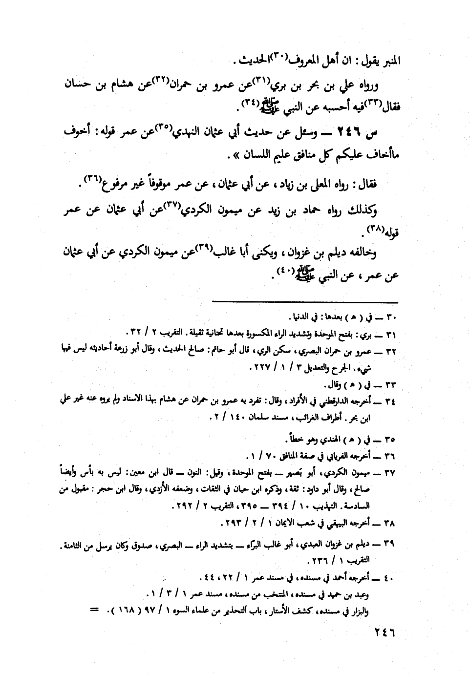 246- وَسُئِلَ عَنْ حَدِيثِ أَبِي عُثْمَانَ النَّهْدِيِّ، عَنْ عُمَرَ قَوْلَهُ أَخْوَفُ مَا أَخَافُ عَلَيْكُمْ كُلُّ مُنَافِقٍ عَلِيمُ اللِّسَانِ.