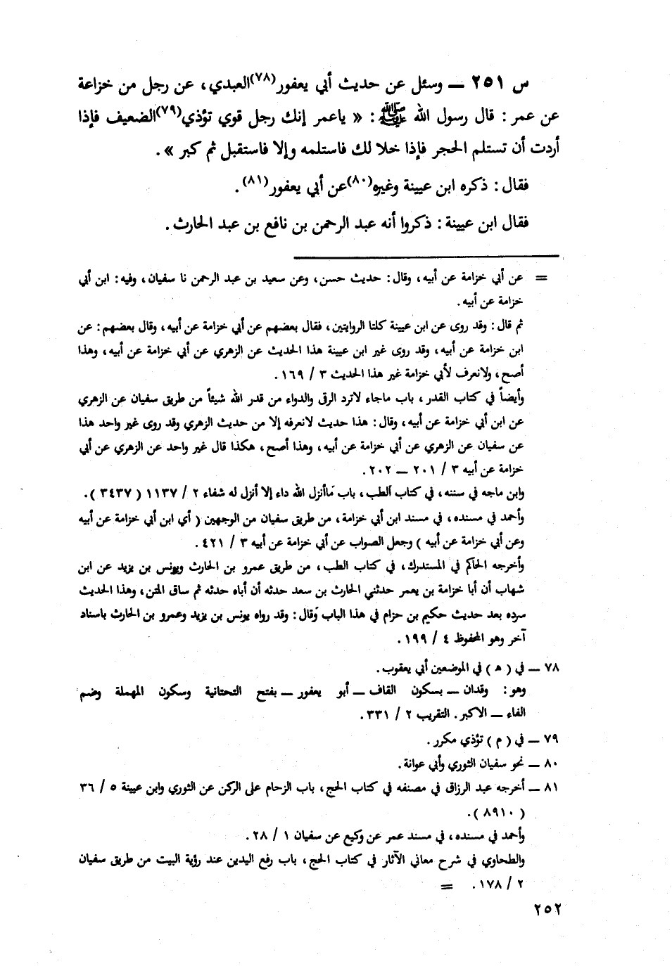251- وَسُئِلَ عَنْ حَدِيثِ أَبِي يَعْفُورٍ الْعَبْدِيِّ، عَنْ رَجُلٍ مِنْ خُزَاعَةَ، عَنْ عُمَرَ، قَالَ رَسُولُ اللَّهِ صَلَّى اللَّهُ عَلَيْهِ وَسَلَّمَ: يَا عُمَرُ، إِنَّكَ رَجُلٌ قَوِيٌّ تُؤْذِي الضَّعِيفَ فَإِذَا أَرَدْتَ أَنْ تَسْتَلِمَ الْحَجَرَ فَإِذَا خَلَا لَكَ فَاسْتَلِمْهُ، وَإِلَّا فَاسْتَقْبِلْ ثُمَّ كَبِّرْ.