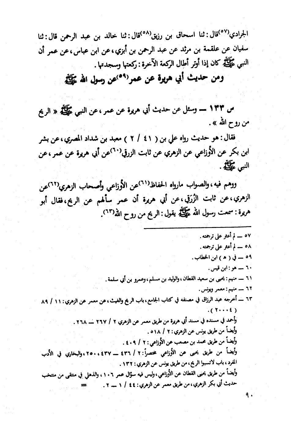 133- وسئل عَنْ حَدِيثِ أَبِي هُرَيْرَةَ، عَنْ عُمَرَ، عَنِ النَّبِيِّ صَلَّى اللَّهُ عَلَيْهِ وَسَلَّمَ: الرِّيحُ مِنْ رَوْحِ اللَّهِ.