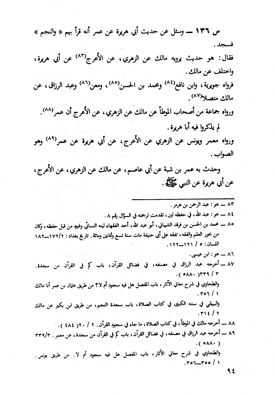 136- وَسُئِلَ عَنْ حَدِيثِ أَبِي هُرَيْرَةَ، عَنْ عُمَرَ أَنَّهُ قَرَأَ بِهِمْ وَالنَّجْمُ فَسَجَدَ.