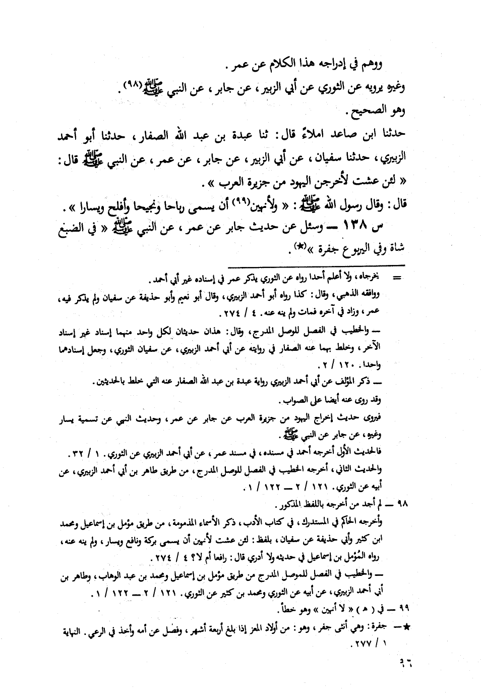 حَدَّثَنَا ابْنُ صَاعِدٍ إِمْلَاءً، قال: حدثنا عَبْدَةُ بْنُ عَبْدِ اللَّهِ الصَّفَّارُ، حَدَّثَنَا أَبُو أَحْمَدَ الزُّبَيْرِيُّ، حَدَّثَنَا سُفْيَانُ، عَنْ أَبِي الزُّبَيْرِ، عَنْ جَابِرٍ، عَنْ عُمَرَ، عَنِ النَّبِيِّ صَلَّى اللَّهُ عَلَيْهِ وَسَلَّمَ قَالَ: لَئِنْ عِشْتُ لَأُخْرِجَنَّ الْيَهُودَ مِنْ جَزِيرَةِ الْعَرَبِ.