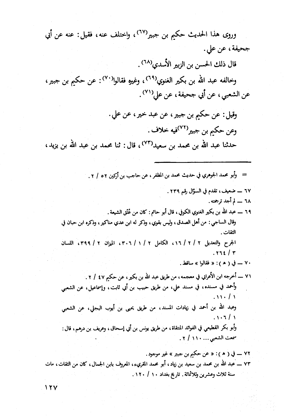 وَخَالَفَهُ عَبْدُ اللَّهِ بْنُ بُكَيْرٍ الْغَنَوِيُّ وَغَيْرُهُ فَقَالُوا عَنْ حَكِيمِ بْنِ جُبَيْرٍ، عَنِ الشَّعْبِيِّ، عَنْ أَبِي جُحَيْفَةَ عَنْ عَلِيٍّ.