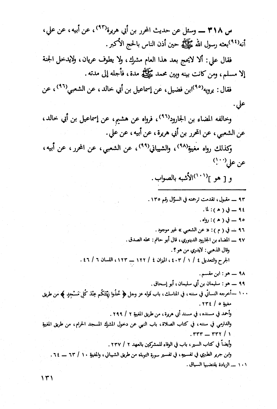 318- وَسُئِلَ عَنْ حَدِيثِ الْمُحَرِّرِ بْنِ أَبِي هُرَيْرَةَ، عَنْ أَبِيهِ، عَنْ عَلِيٍّ، أَنَّهُ بَعَثَهُ رَسُولُ اللَّهِ صَلَّى اللَّهُ عَلَيْهِ وَسَلَّمَ حِينَ أَذَّنَ النَّاسُ بِالْحَجِّ الْأَكْبَرِ.