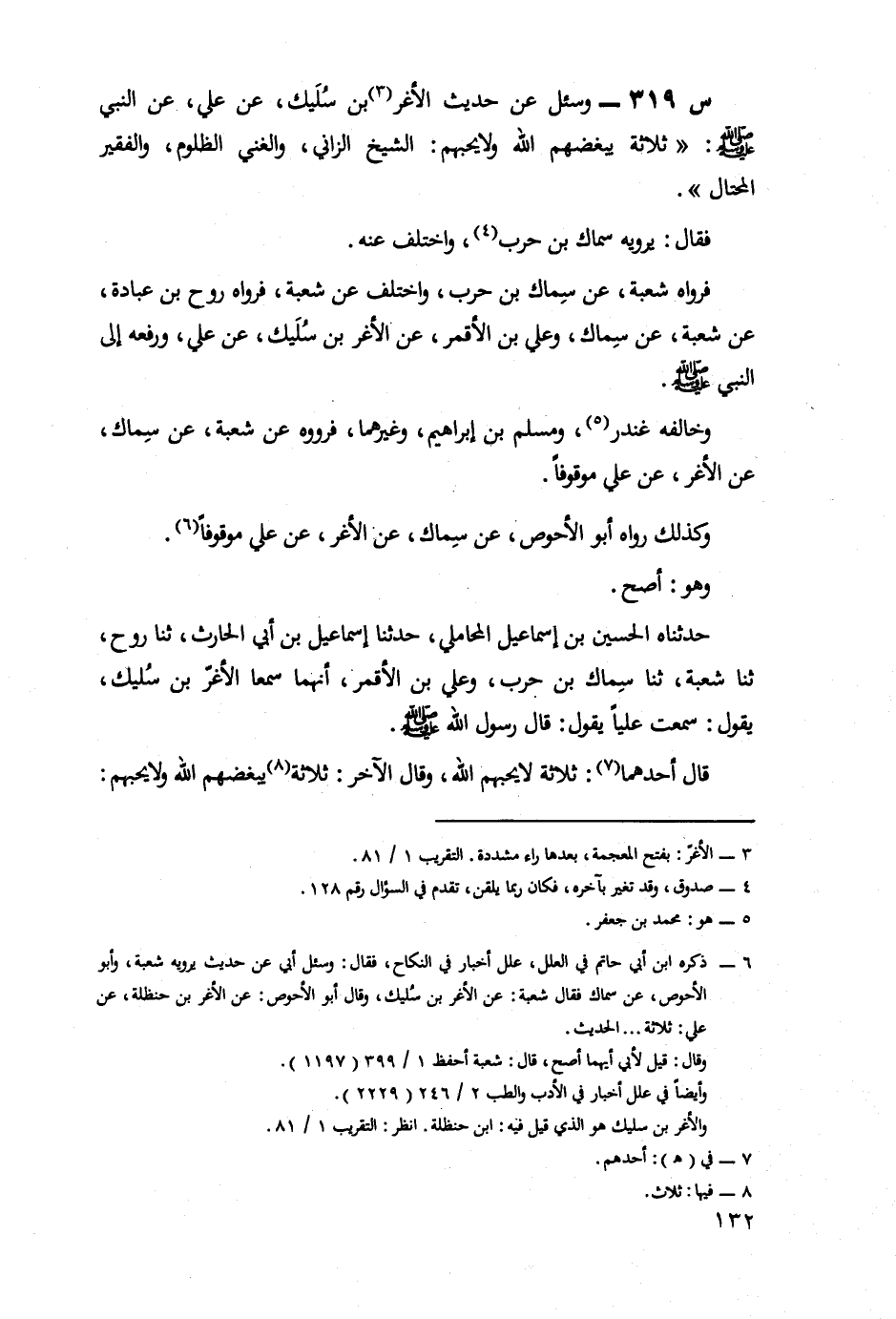 319- وَسُئِلَ عَنْ حَدِيثِ الْأَغَرِّ بْنِ سُلَيْكٍ، عَنْ عَلِيٍّ، عَنِ النَّبِيِّ صَلَّى اللَّهُ عَلَيْهِ وسلم: ثَلَاثَةٌ يُبْغِضُهُمُ اللَّهُ وَلَا يُحِبُّهُمُ: الشَّيْخُ الزَّانِي، وَالْغَنِيُّ الظَّلُومُ، وَالْفَقِيرُ الْمُحْتَالُ.