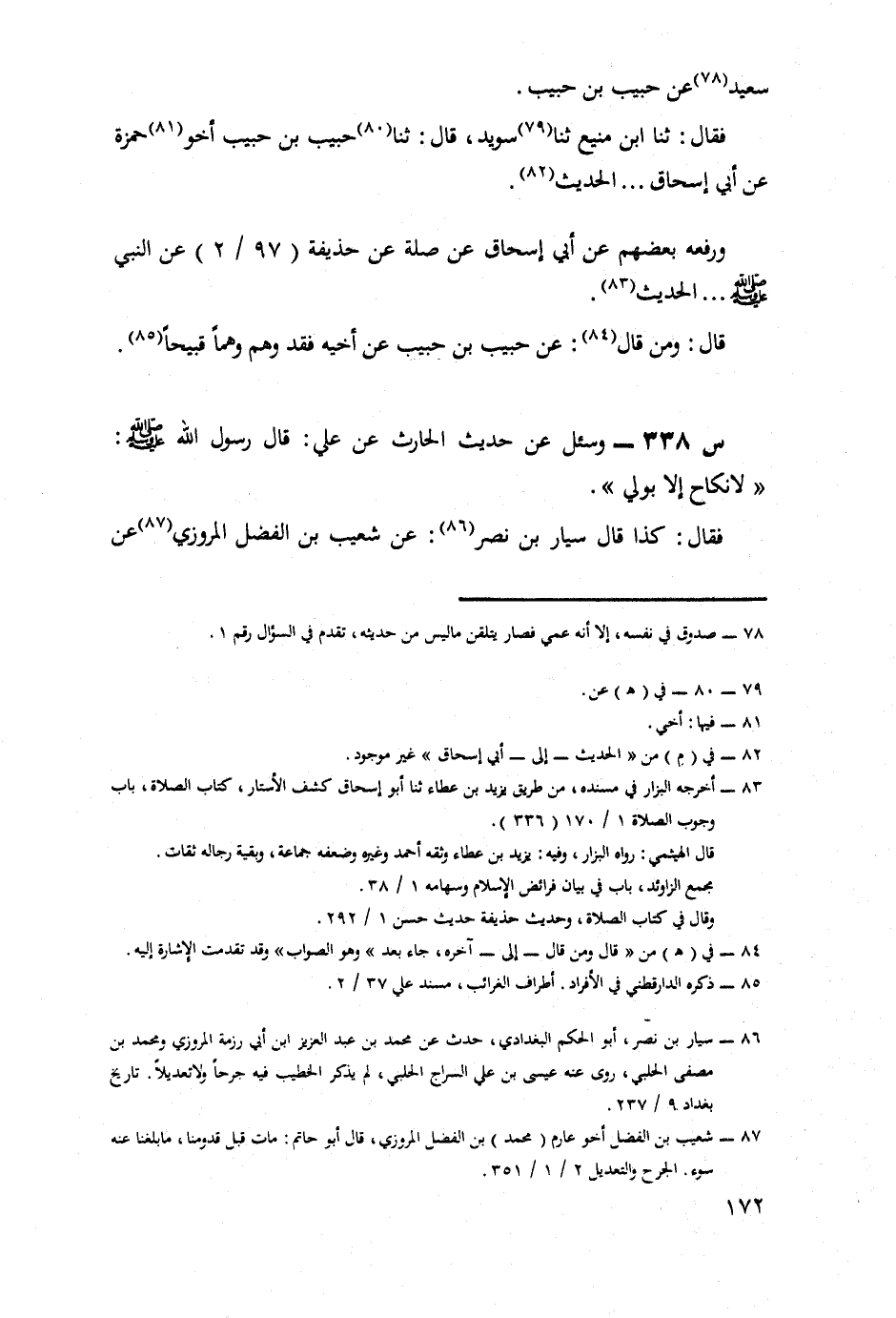 338- وَسُئِلَ عَنْ حَدِيثِ الْحَارِثِ، عَنْ عَلِيٍّ، قَالَ رسول الله صلى الله عليه وسلم: لا نِكَاحَ إِلَّا بَوَلِيٍّ.