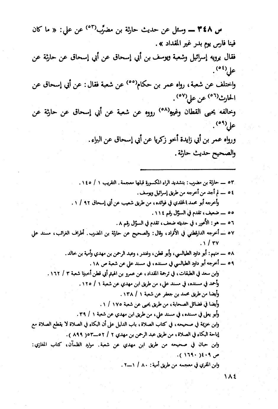 348- وَسُئِلَ عَنْ حَدِيثِ حَارِثَةَ بْنِ مُضَرِّبٍ، عَنْ عَلِيٍّ مَا كَانَ فِينَا فَارِسٌ يَوْمَ بَدْرٍ غَيْرُ الْمِقْدَادِ.