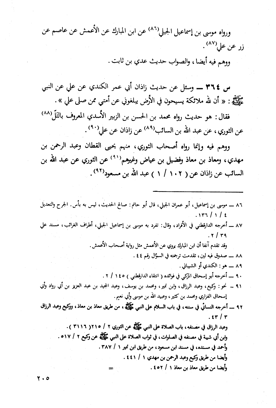 364- وَسُئِلَ عَنْ حَدِيثِ زَاذَانَ أَبِي عُمَرَ الْكِنْدِيِّ، عَنْ عَلِيٍّ، عَنِ النَّبِيِّ صَلَّى اللَّهُ عَلَيْهِ وَسَلَّمَ؛ أَنَّ لِلَّهِ مَلَائِكَةً يَسِيحُونَ فِي الْأَرْضِ يُبَلِّغُونِي عَنْ أُمَّتِي مِمَّنْ صَلَّى عَلَيَّ.