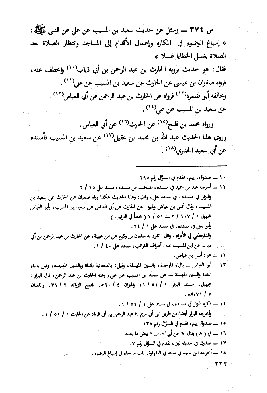374- وَسُئِلَ عَنْ حَدِيثِ سَعِيدِ بْنِ الْمُسَيِّبِ، عَنْ عَلِيٍّ، عَنِ النَّبِيِّ صَلَّى اللَّهُ عَلَيْهِ وَسَلَّمَ: إِسْبَاغُ الْوُضُوءِ فِي الْمَكَارِهِ وَإِعْمَالُ الْأَقْدَامِ إِلَى الْمَسَاجِدِ وَانْتِظَارُ الصَّلَاةِ بَعْدَ الصَّلَاةِ يَغْسِلُ الْخَطَايَا غَسْلًا.
