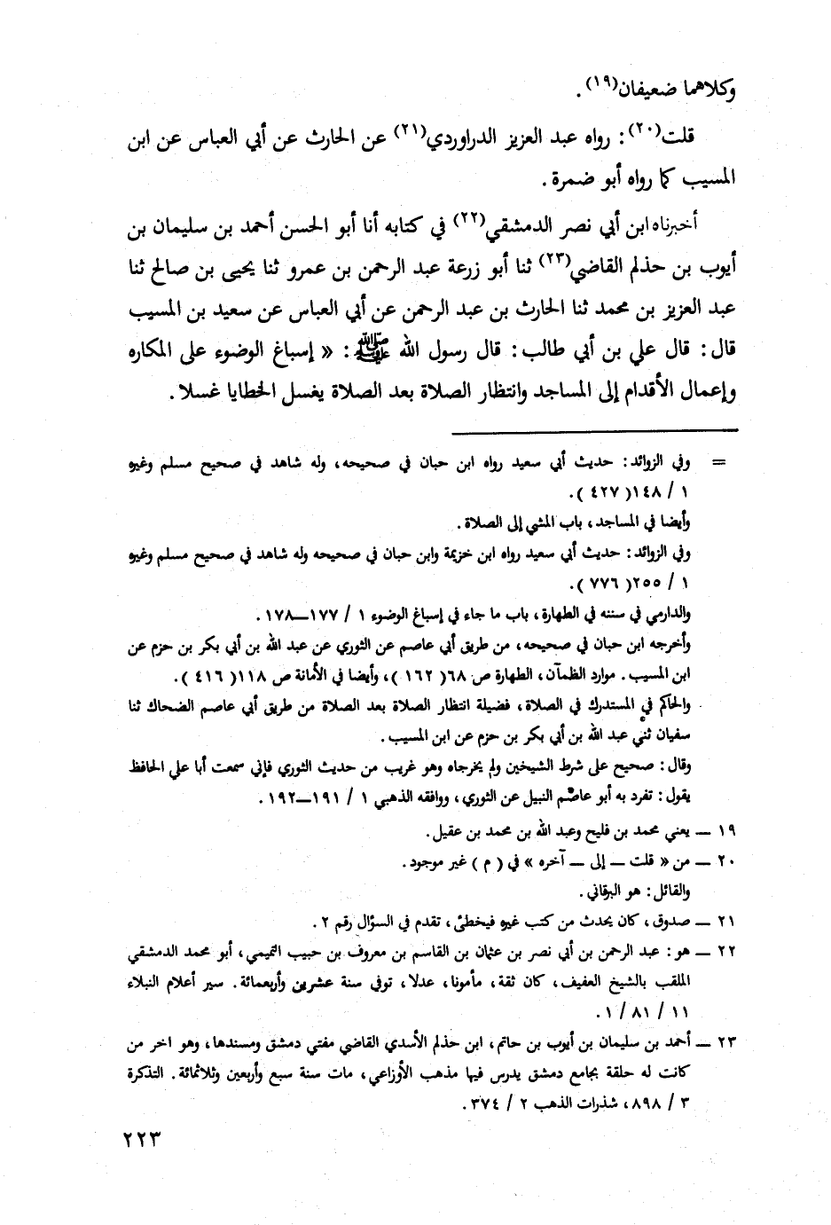 أَخْبَرَنَاهُ ابْنُ أَبِي نَصْرٍ الدمشقي في كتابه، أخبرنا أَبُو الْحَسَنِ أَحْمَدُ بْنُ سُلَيْمَانَ بْنِ أَيُّوبَ بن حذلم القاضي، حدثنا أبو زرعة عبد الرحمن بن عمرو، حدثنا يحيى بن صالح، حدثنا عبد العزيز بن محمد، حدثنا الحارث بن عبد الرحمن، عن أبي العباس، عن سعيد بن المسيب، قال: قال علي بْنُ أَبِي طَالِبٍ: قَالَ رَسُولُ اللَّهِ صَلَّى اللَّهُ عَلَيْهِ وَسَلَّمَ: إِسْبَاغُ الْوُضُوءِ عَلَى الْمَكَارِهِ وَإِعْمَالُ الْأَقْدَامِ إِلَى الْمَسَاجِدِ وَانْتِظَارُ الصَّلَاةِ بَعْدَ الصَّلَاةِ يَغْسِلُ الْخَطَايَا غَسْلًا.