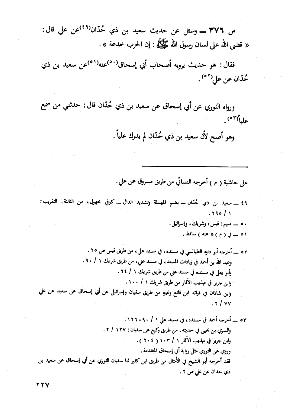 376- وَسُئِلَ عَنْ حَدِيثِ سَعِيدِ بْنِ ذِي حُدَّانٍ، عَنْ عَلِيٍّ، قَالَ: قَضَى اللَّهُ عَلَى لِسَانِ رسول الله صلى الله عليه وسلم: إن الْحَرْبَ خُدْعَةٌ.