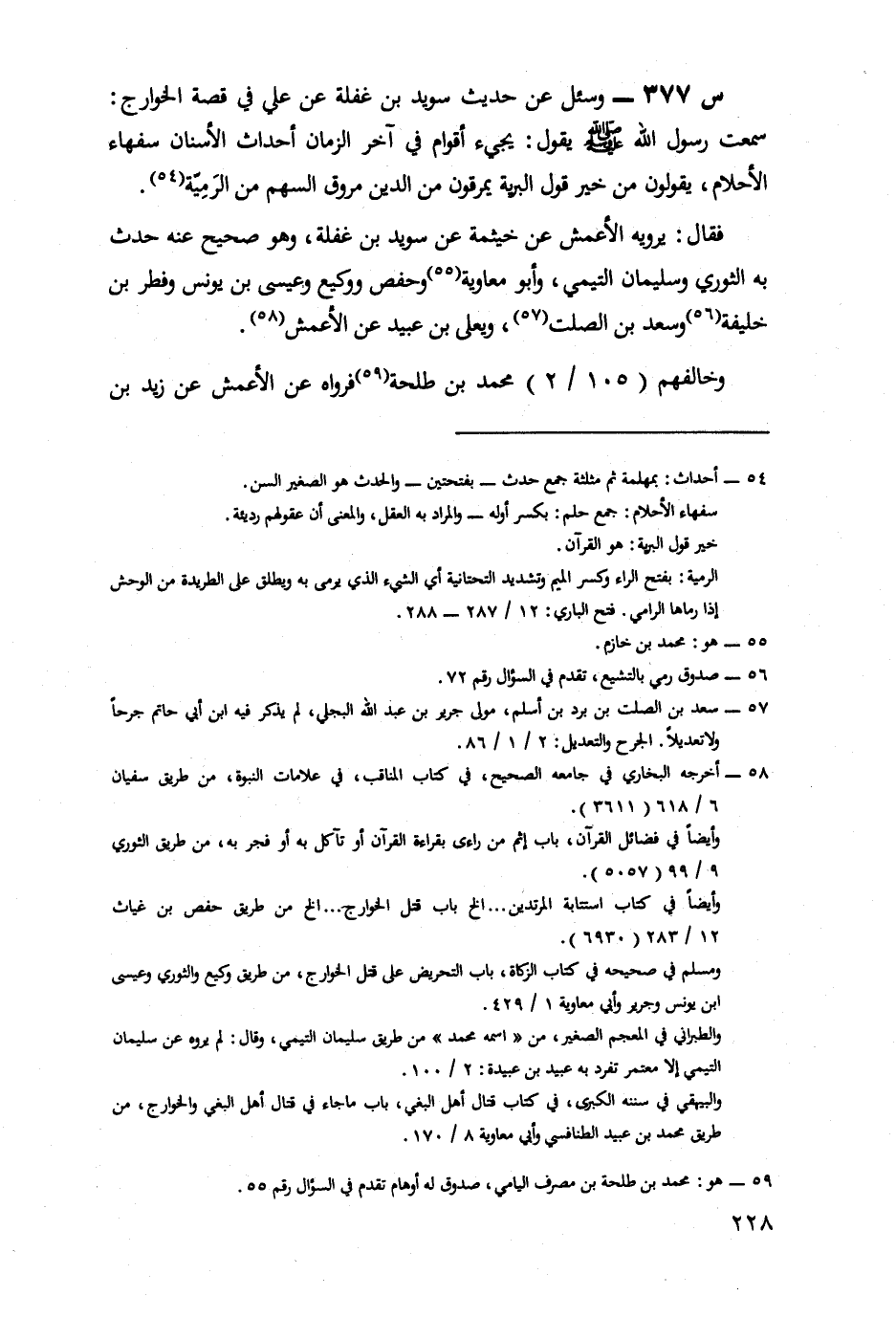 377- وَسُئِلَ عَنْ حَدِيثِ سُوَيْدِ بْنِ غَفْلَةَ، عَنْ عَلِيٍّ فِي قِصَّةِ الْخَوَارِجِ: سَمِعْتُ رَسُولَ اللَّهِ صَلَّى اللَّهُ عَلَيْهِ وَسَلَّمَ يَقُولُ: يَجِيءُ أَقْوَامٌ فِي آخِرِ الزَّمَانِ أَحْدَاثُ الْأَسْنَانِ سُفَهَاءُ الْأَحْلَامِ، يَقُولُونَ مِنْ خَيْرِ قَوْلِ الْبَرِيَّةِ يَمْرُقُونَ مِنَ الدِّينِ مُرُوقَ السَّهْمِ مِنَ الرَّمِيَّةِ.
