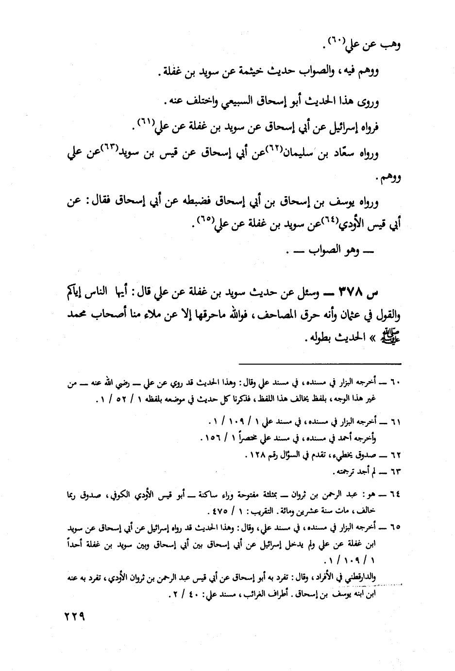 378- وَسُئِلَ عَنْ حَدِيثِ سُوَيْدِ بْنِ غَفْلَةَ، عَنْ عَلِيٍّ قَالَ أَيُّهَا النَّاسُ إِيَّاكُمْ وَالْقَوْلَ فِي عُثْمَانَ وَأَنَّهُ حَرَقَ الْمَصَاحِفَ فَوَاللَّهِ مَا حَرَقَهَا إِلَّا عَنْ مِلَاءٍ مِنَّا أَصْحَابِ مُحَمَّدٍ صَلَّى اللَّهُ عَلَيْهِ وَسَلَّمَ الْحَدِيثَ بِطُولِهِ.