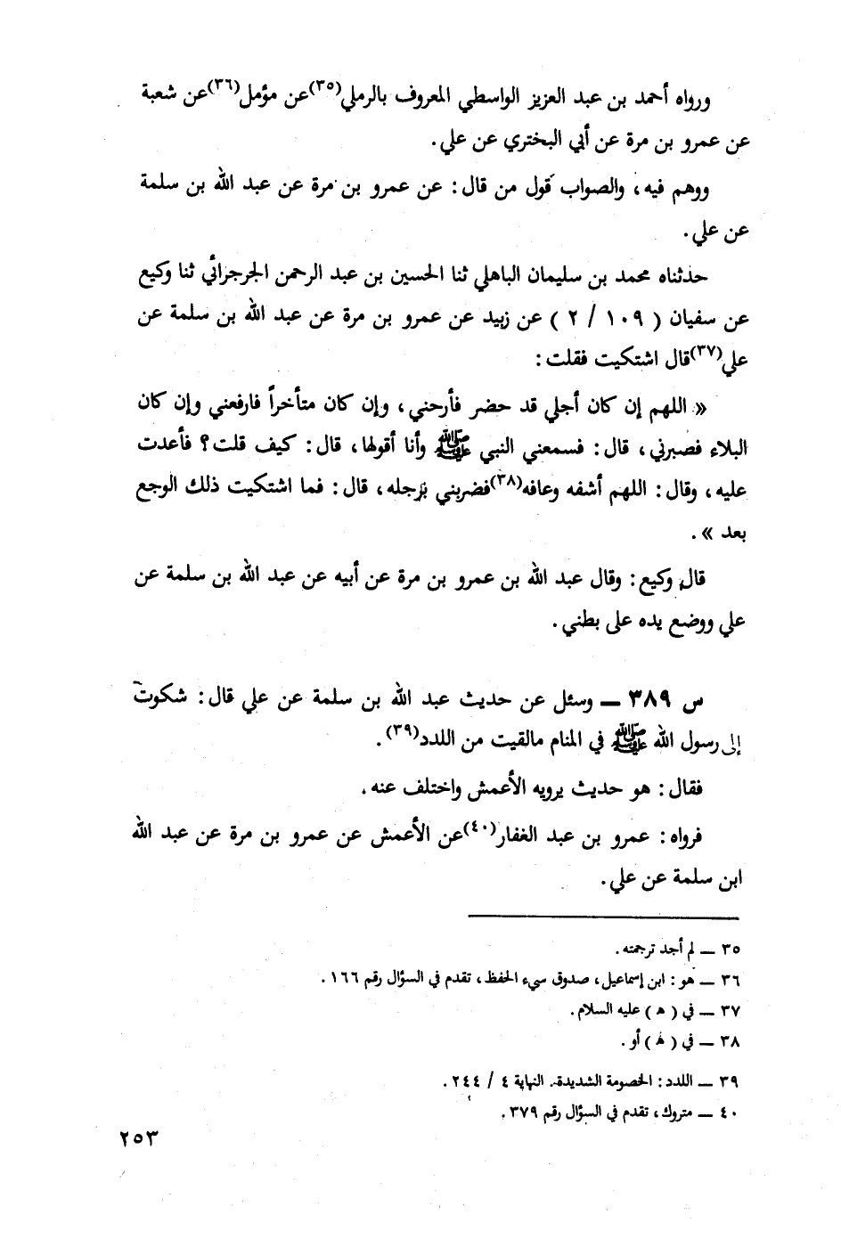 حَدَّثَنَاهُ مُحَمَّدُ بْنُ سُلَيْمَانَ الباهلي، حدثنا الحسين بن عبد الرحمن الجرجرائي، حدثنا وَكِيعٌ، عَنْ سُفْيَانَ، عَنْ زُبَيْدٍ، عَنْ عَمْرِو بْنِ مرة، عن عبد الله بن سلمة، عَنْ عَلِيٍّ، قَالَ: اشْتَكَيْتُ، فَقُلْتُ: اللَّهُمَّ إِنْ كَانَ أَجَلِي قَدْ حَضَرَ فَأَرِحْنِي، وَإِنْ كَانَ مُتَأَخِّرًا فَارْفَعْنِي، وَإِنْ كَانَ الْبَلَاءَ فَصَبِّرْنِي، قَالَ: فَسَمِعَنِي النَّبِيُّ صَلَّى اللَّهُ عَلَيْهِ وَسَلَّمَ وَأَنَا أَقْوُلُهَا، قَالَ: كَيْفَ قُلْتُ؟ فَأَعَدْتُ عَلَيْهِ، وَقَالَ: اللَّهُمَّ اشْفِهِ وَعَافِهِ فَضَرَبَنِي بِرْجِلِهِ، قَالَ: فَمَا اشْتَكَيْتُ ذَلِكَ الْوَجَعَ بَعْدُ.