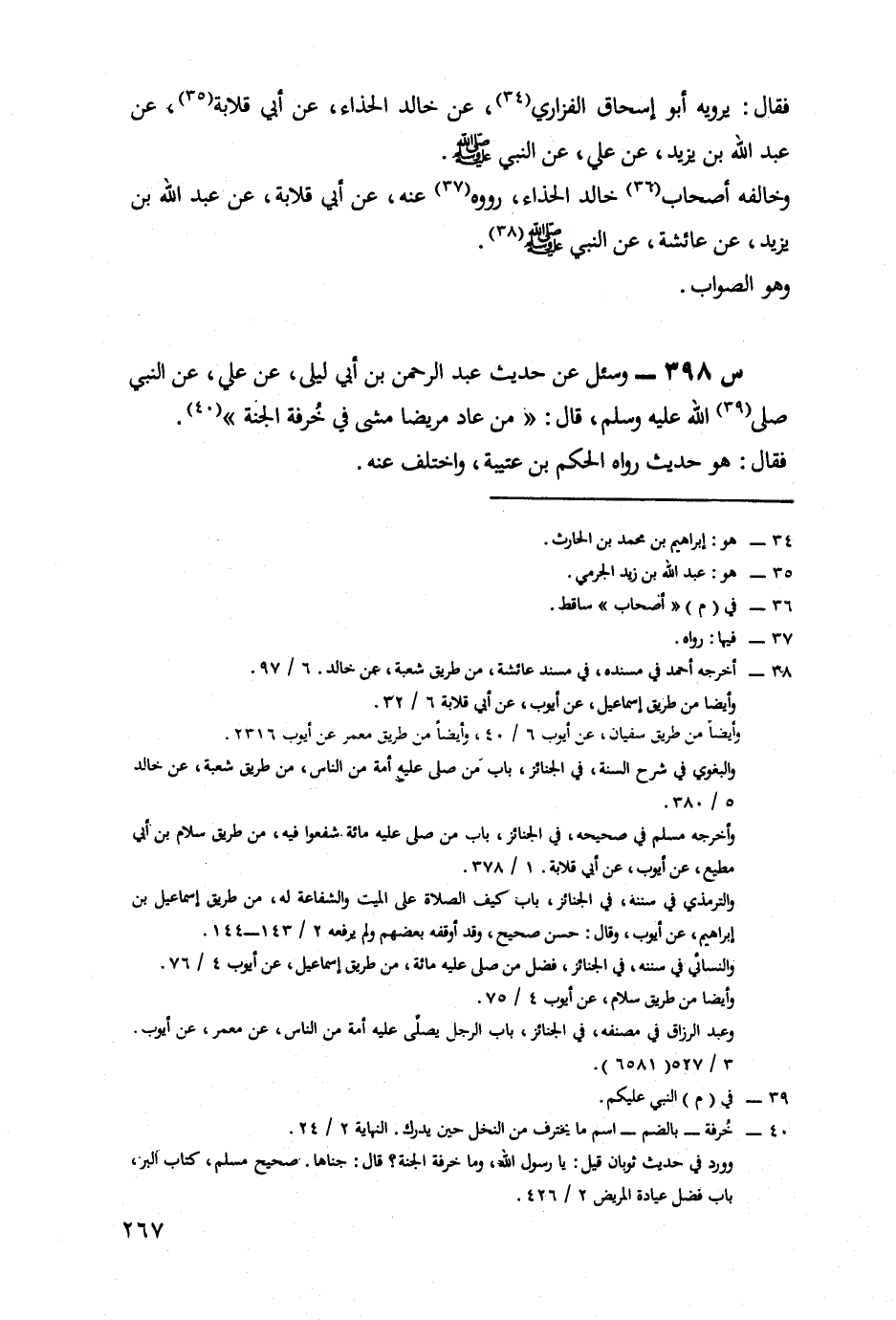 398- وَسُئِلَ عَنْ حَدِيثِ عَبْدِ الرَّحْمَنِ بْنِ أَبِي لَيْلَى، عَنْ عَلِيٍّ، عَنِ النَّبِيِّ صَلَّى اللَّهُ عَلَيْهِ وَسَلَّمَ قَالَ: مَنْ عَادَ مَرِيضًا مَشَى فِي خُرْفَةِ الْجَنَّةِ.