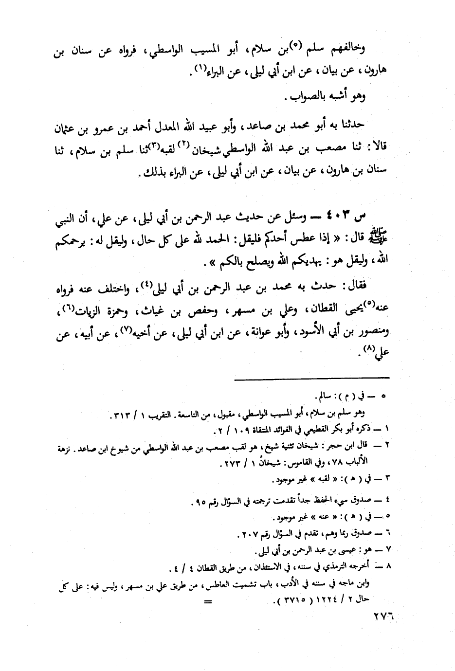 403- وَسُئِلَ عَنْ حَدِيثِ عَبْدِ الرَّحْمَنِ بْنِ أَبِي لَيْلَى، عَنْ عَلِيٍّ، أَنّ النَّبِيَّ صَلَّى اللَّهُ عَلَيْهِ وَسَلَّمَ قَالَ: إِذَا عَطَسَ أَحَدُكُمْ، فَلْيَقُلِ: الْحَمْدُ لِلَّهِ عَلَى كُلِّ حَالٍ، وَلْيَقُلْ لَهُ: يَرْحَمُكُمُ اللَّهُ، وَلْيَقُلْ هُوَ: يَهْدِيكُمُ اللَّهُ وَيُصْلِحُ بَالَكُمْ.