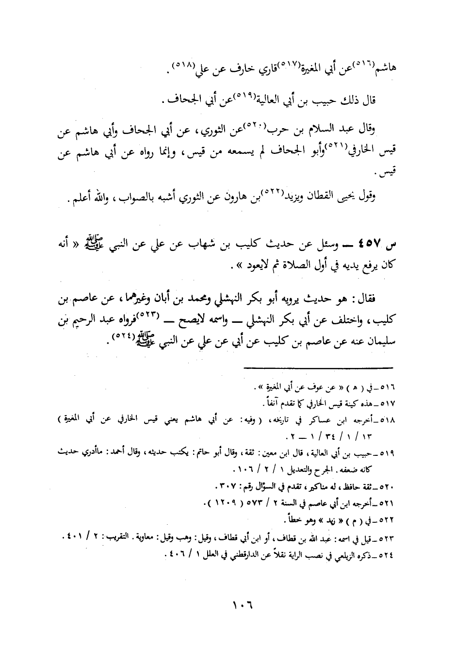 457- وَسُئِلَ عَنْ حَدِيثِ كُلَيْبِ بْنِ شِهَابٍ، عَنْ عَلِيٍّ، عَنِ النَّبِيِّ صَلَّى اللَّهُ عَلَيْهِ وسلم؛ أَنَّهُ كَانَ يَرْفَعُ يَدَيْهِ فِي أَوَّلِ الصَّلَاةِ ثُمَّ لَا يَعُودُ.