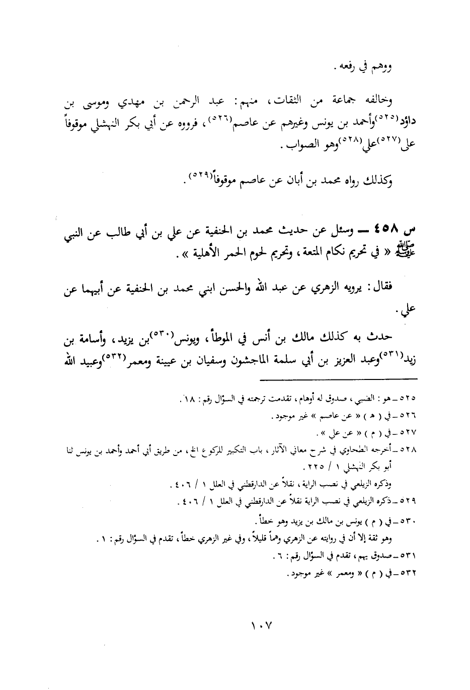 458- وَسُئِلَ عَنْ حَدِيثِ مُحَمَّدِ بْنِ الْحَنَفِيَّةِ، عَنْ عَلِيِّ بْنِ أَبِي طَالِبٍ، عَنِ النَّبِيِّ صَلَّى اللَّهُ عَلَيْهِ وَسَلَّمَ؛ فِي تَحْرِيمِ نِكَاحِ الْمُتْعَةِ، وَتَحْرِيمِ لُحُومِ الْحُمُرِ الْأَهْلِيَّةِ.