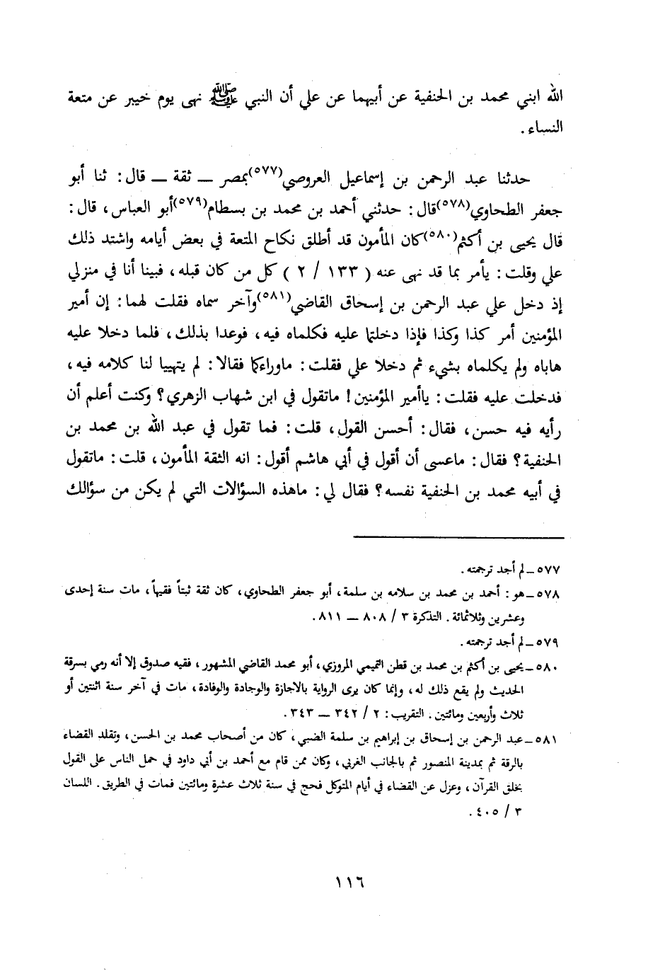 حَدَّثَنَا عَبْدُ الرَّحْمَنِ بْنُ إِسْمَاعِيلَ الْعَرُوصِيُّ بِمِصْرَ ثقة، قال: حدثنا أَبُو جَعْفَرٍ الطَّحَاوِيُّ، قَالَ: حَدَّثَنِي أَحْمَدُ بْنُ مُحَمَّدِ بْنِ بِسْطَامٍ أَبُو الْعَبَّاسِ، قَالَ: قَالَ يَحْيَى بْنُ أَكْثَمَ: كَانَ الْمَأْمُونُ قَدْ أَطْلَقَ نِكَاحَ الْمُتْعَةِ فِي بَعْضِ أَيَّامِهِ، وَاشْتَدَّ ذَلِكَ عَلَيَّ، وَقُلْتُ: يَأْمُرُ بِمَا قَدْ نَهَى عَنْهُ كُلُّ مَنْ كَانَ قَبْلَهُ، فَبَيْنَا أَنَا فِي مَنْزِلِي إِذْ دَخَلَ عَلَيَّ عَبْدُ الرَّحْمَنِ بْنُ إِسْحَاقَ الْقَاضِي، وَآخَرُ سَمَّاهُ، فَقُلْتُ لَهُمَا: إِنَّ أَمِيرَ الْمُؤْمِنِينَ أَمَرَ كَذَا وَكَذَا فَإِذَا دَخَلْتُمَا عَلَيْهِ فَكَلِّمَاهُ فِيهِ، فَوَعَدَا بِذَلِكَ، فَلَمَّا دَخَلَا عَلَيْهِ هَابَاهُ وَلَمْ يُكَلِّمَاهُ بِشَيْءٍ، ثُمَّ دَخَلَا علي، فقلت: ما وراءكما، فقالا: لم يتهييا لَنَا كَلَامُهُ فِيهِ، فَدَخَلْتُ عَلَيْهِ، فَقُلْتُ: يَا أَمِيرَ الْمُؤْمِنِينَ، مَا تَقُولُ فِي ابْنِ شِهَابٍ الزُّهْرِيِّ؟ وَكُنْتُ أَعْلَمُ أَنَّ رَأْيَهُ فِيهِ حَسَنٌ، فَقَالَ: أَحْسَنُ الْقَوْلِ، قُلْتُ: فَمَا تَقُولُ فِي عَبْدِ اللَّهِ بْنِ مُحَمَّدِ بْنِ الْحَنَفِيَّةِ؟ فَقَالَ: مَا عَسَى أَنْ أَقُولَ فِي أَبِي هَاشِمٍ، أَقُولُ: إِنَّهُ الثِّقَةُ الْمَأْمُونُ، قُلْتُ: مَا تَقُولُ فِي أَبِيهِ مُحَمَّدِ بْنِ الْحَنَفِيَّةِ نَفْسِهِ؟ فَقَالَ لِي: مَا هَذِهِ السُّؤَالَاتُ الَّتِي لَمْ يَكُنْ مِنْ سُؤَالِكَ فِيمَا قَبْلُ؟ هُوَ الثِّقَةُ الْمُرْضَا،