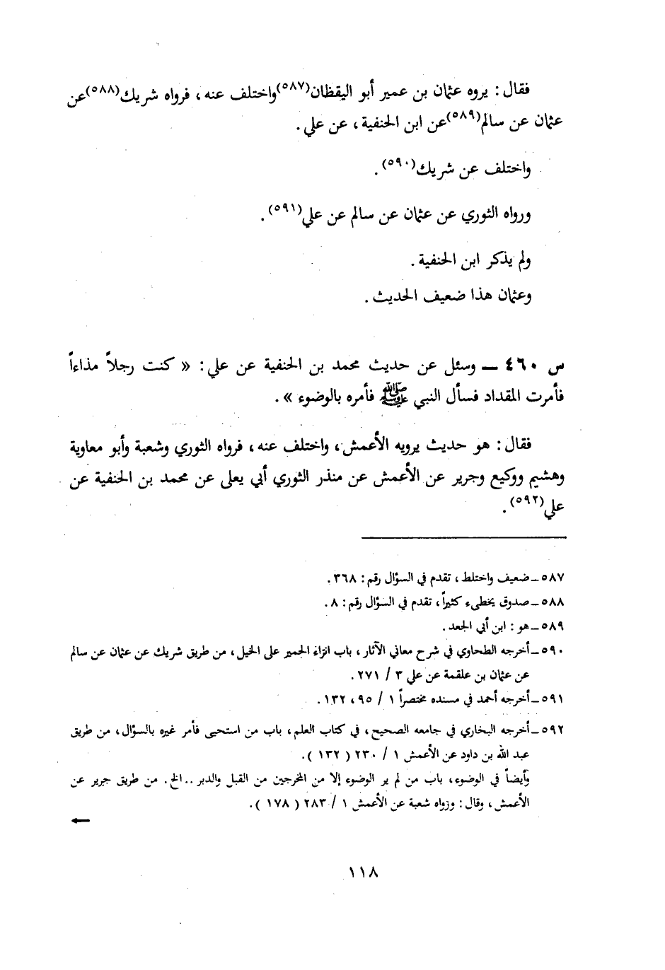 460- وَسُئِلَ عَنْ حَدِيثِ مُحَمَّدِ بْنِ الْحَنَفِيَّةِ، عَنْ علي: كنت رجلا مذاءا فَأَمَرْتُ الْمِقْدَادُ فَسَأَلَ النَّبِيَّ صَلَّى اللَّهُ عَلَيْهِ وَسَلَّمَ فَأَمَرَهُ بِالْوُضُوءِ.