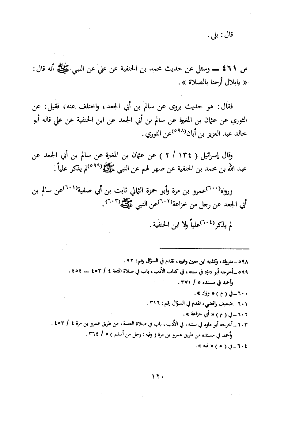 461- وَسُئِلَ عَنْ حَدِيثِ مُحَمَّدِ بْنِ الْحَنَفِيَّةِ، عَنْ عَلِيٍّ، عَنِ النَّبِيِّ صَلَّى اللَّهُ عَلَيْهِ وسلم، أَنَّهُ قَالَ: يَا بِلَالُ أَرِحْنَا بِالصَّلَاةِ.