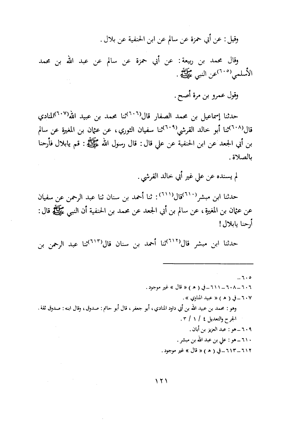 حَدَّثَنَا إِسْمَاعِيلُ بْنُ مُحَمَّدٍ الصَّفَّارُ، قال: حدثنا محمد بن عبيد الله المنادي، قال: حدثنا أبو خالد القرشي، حدثنا سُفْيَانُ الثَّوْرِيُّ، عَنْ عُثْمَانَ بْنِ الْمُغِيرَةِ، عَنْ سَالِمِ بْنِ أَبِي الْجَعْدِ، عَنِ ابْنِ الْحَنَفِيَّةِ، عَنْ عَلِيٍّ، قَالَ: قَالَ رَسُولُ اللَّهِ صَلَّى اللَّهُ عَلَيْهِ وَسَلَّمَ: قُمْ يَا بِلَالُ فَأَرِحْنَا بِالصَّلَاةِ.