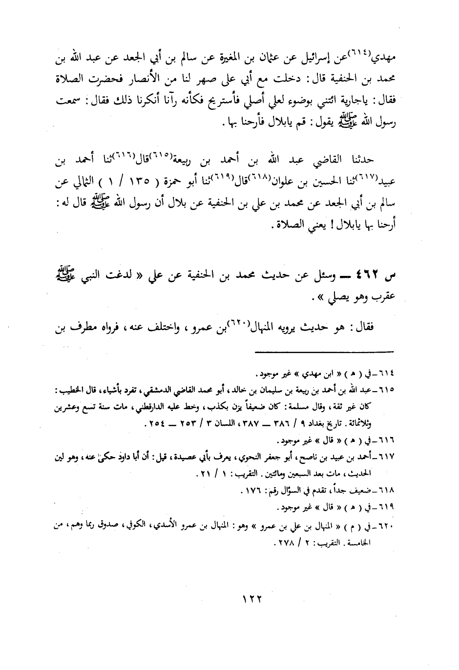462- وَسُئِلَ عَنْ حَدِيثِ مُحَمَّدِ بْنِ الْحَنَفِيَّةِ، عَنْ عَلِيٍّ: لَدَغَتِ النَّبِيُّ صَلَّى اللَّهُ عَلَيْهِ وَسَلَّمَ عَقْرَبٌ وَهُوَ يُصَلِّي.