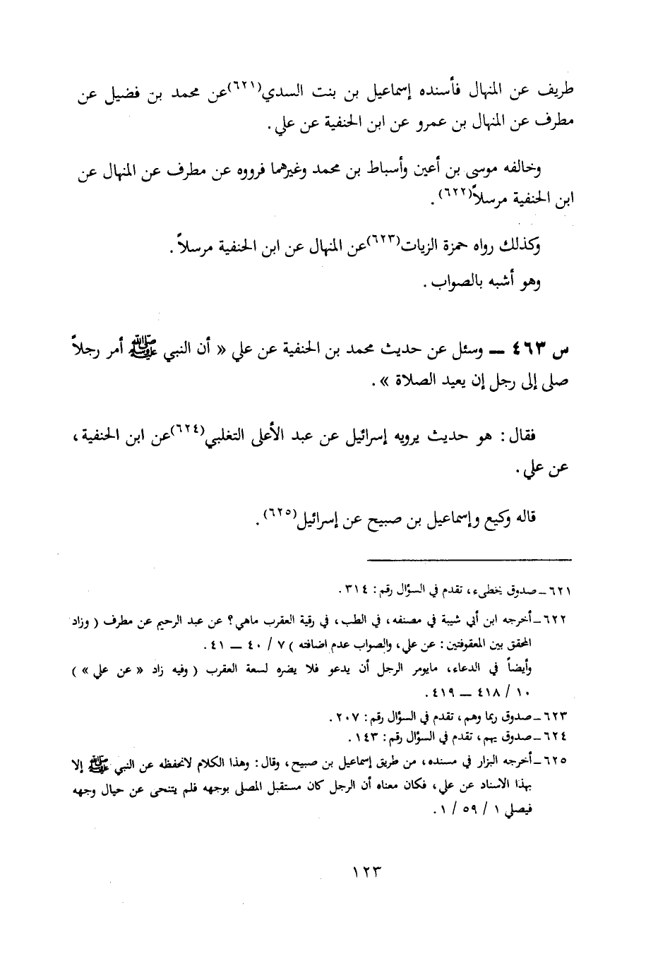 463- وَسُئِلَ عَنْ حَدِيثِ مُحَمَّدِ بْنِ الْحَنَفِيَّةِ، عَنْ علي: أَنَّ النَّبِيَّ صَلَّى اللَّهُ عَلَيْهِ وَسَلَّمَ أَمَرَ رَجُلًا صَلَّى إِلَى رَجُلٍ أَنْ يُعِيدَ الصَّلَاةَ.