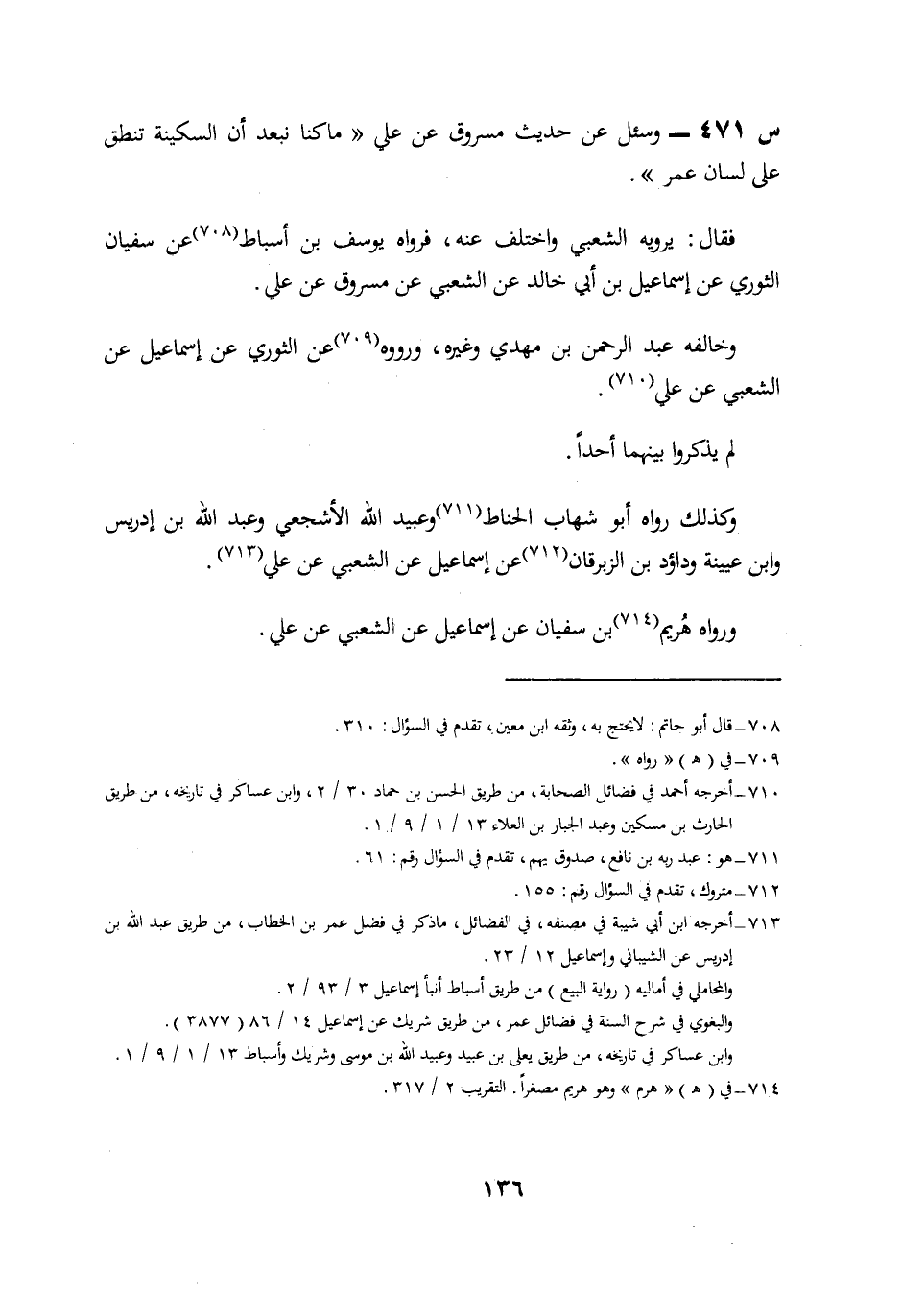 471- وَسُئِلَ عَنْ حَدِيثِ مَسْرُوقٍ، عَنْ عَلِيٍّ مَا كُنَّا نُبْعِدُ أَنَّ السَّكِينَةَ تَنْطِقُ عَلَى لِسَانِ عُمَرَ.