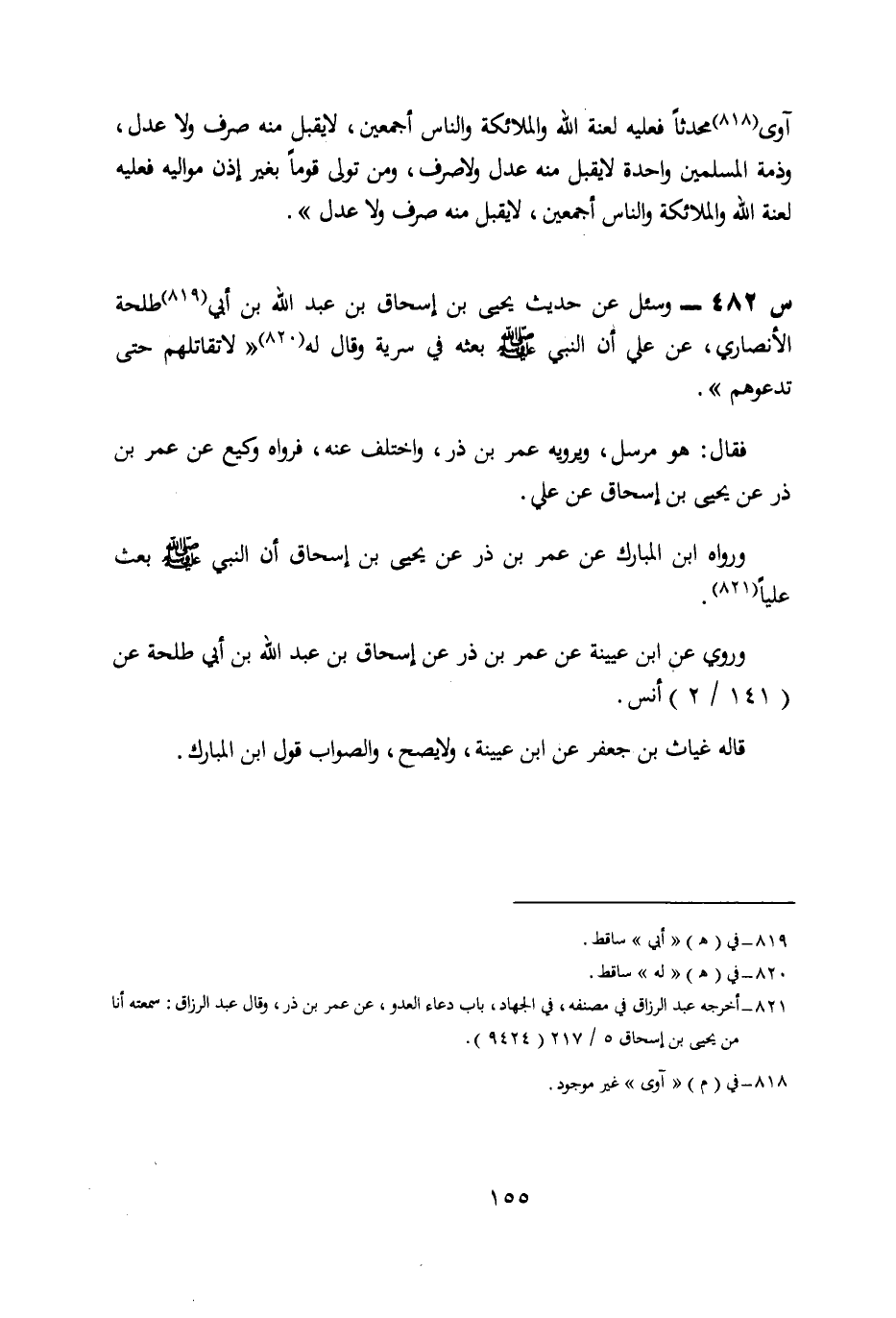 482- وسئل عن حديث يحيى بن إِسْحَاقَ بْنِ عَبْدِ اللَّهِ بْنِ أَبِي طَلْحَةَ الْأَنْصَارِيِّ، عَنْ عَلِيٍّ، أَنّ النَّبِيَّ صَلَّى اللَّهُ عَلَيْهِ وَسَلَّمَ بَعَثَهُ فِي سَرِيَّةٍ، وَقَالَ لَهُ: لَا تُقَاتِلْهُمْ حَتَّى تَدْعُوَهُمْ.