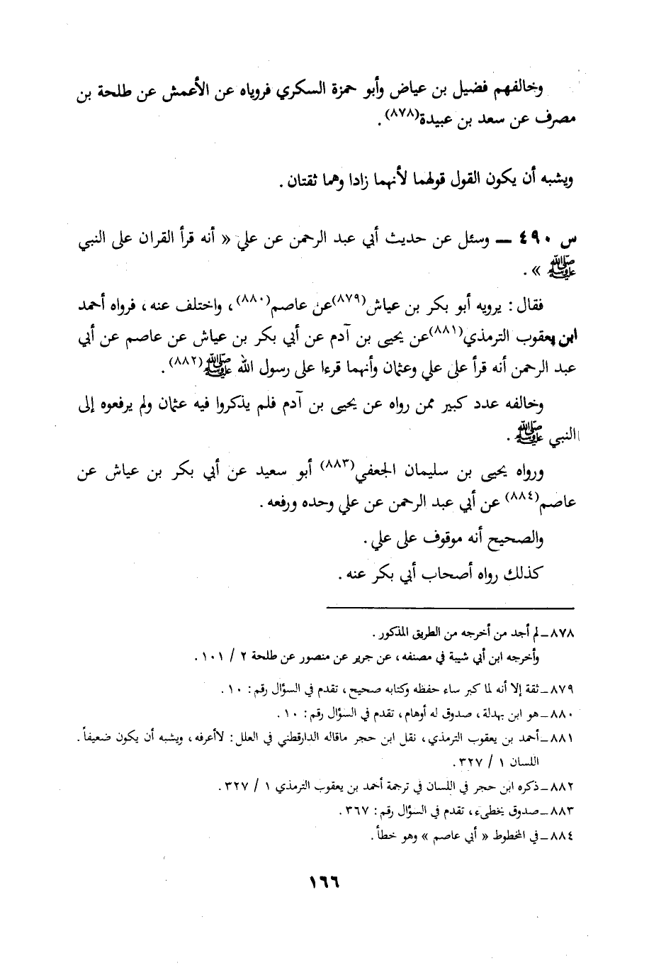 490- وسئل عن حديث أبي عبد الرحمن، عن عَلِيٍّ أَنَّهُ قَرَأَ الْقُرْآنَ عَلَى النَّبِيِّ صَلَّى اللَّهُ عَلَيْهِ وَسَلَّمَ.