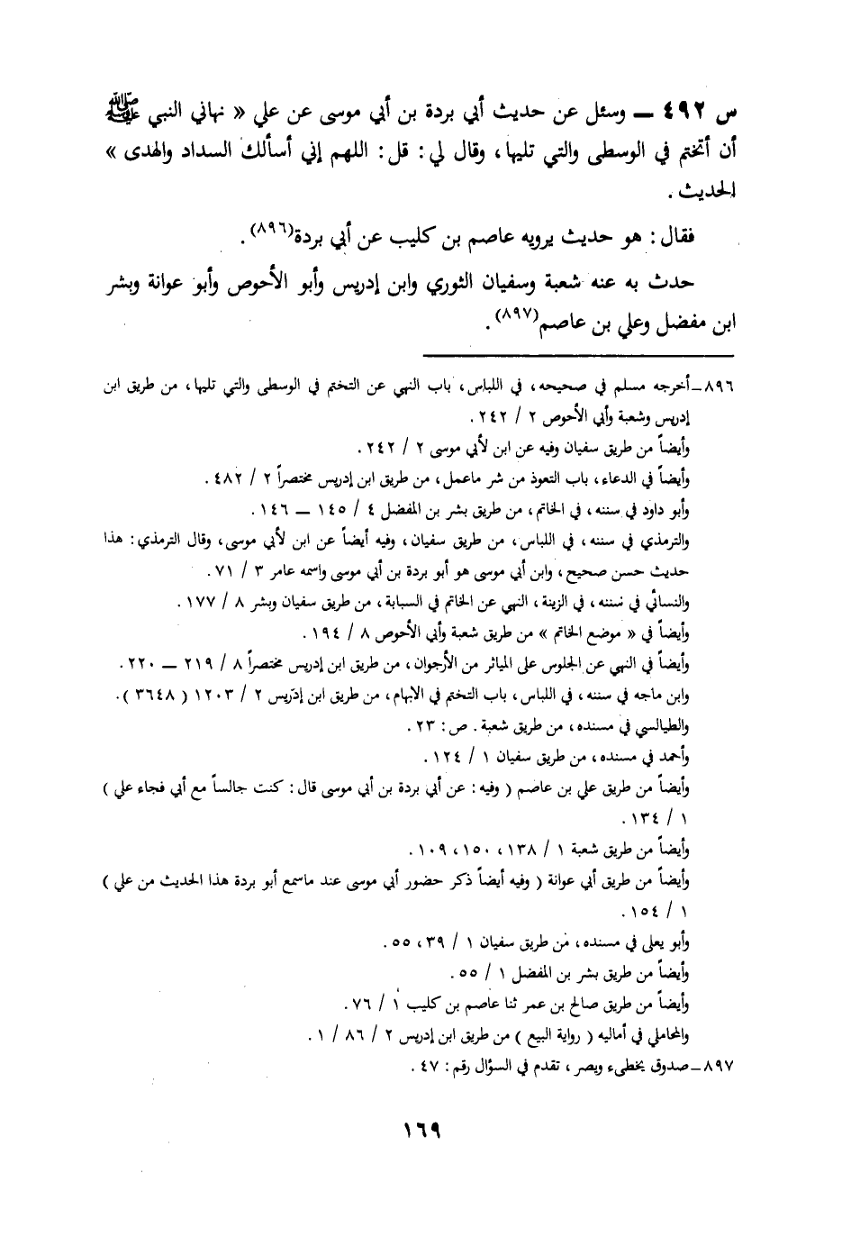 492- وَسُئِلَ عَنْ حَدِيثِ أَبِي بُرْدَةَ بْنِ أَبِي مُوسَى، عَنْ عَلِيٍّ: نَهَانِي النَّبِيُّ صَلَّى اللَّهُ عَلَيْهِ وَسَلَّمَ أَنْ أَتَخَتَّمَ فِي الْوُسْطَى وَالَّتِي تَلِيهَا، وَقَالَ لِي: قُلِ: اللَّهُمَّ إِنِّي أَسْأَلُكَ السَّدَادَ وَالْهُدَى ... الْحَدِيثَ.