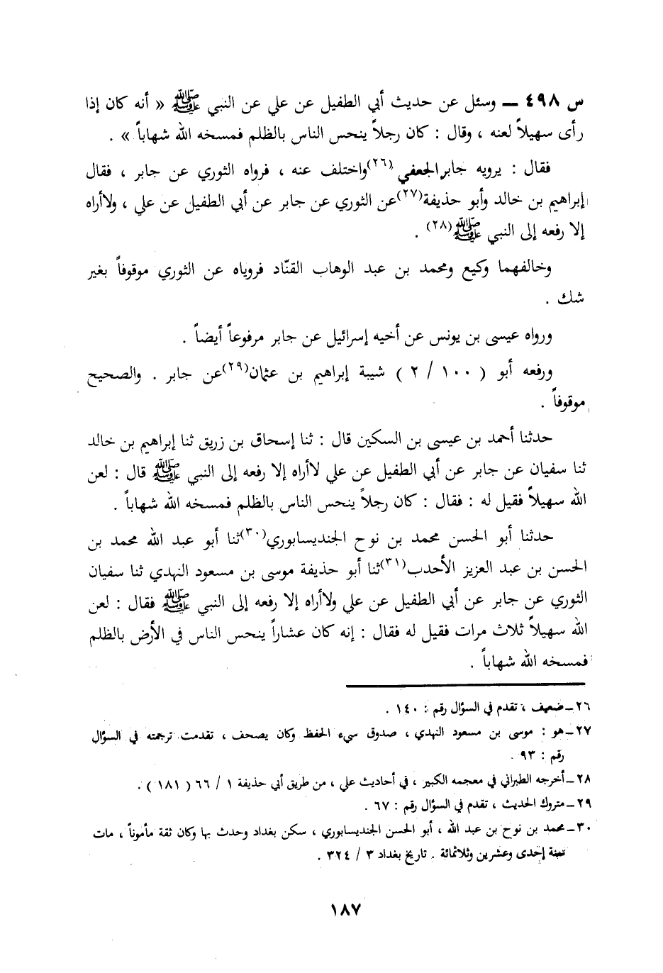498- وَسُئِلَ عَنْ حَدِيثِ أَبِي الطُّفَيْلِ، عَنْ عَلِيٍّ، عَنِ النَّبِيِّ صَلَّى اللَّهُ عَلَيْهِ وسلم؛ أنه كَانَ إِذَا رَأَى سُهَيْلًا لَعَنَهُ، وَقَالَ: كَانَ رجلا ينحس النَّاسَ بِالظُّلْمِ فَمَسَخَهُ اللَّهُ شِهَابًا.