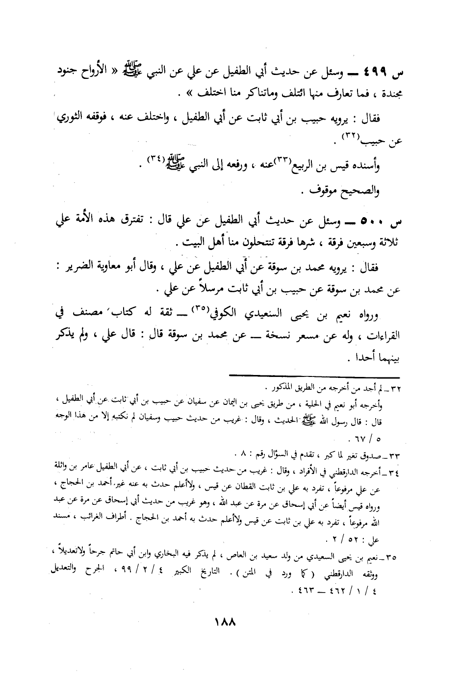 500- وَسُئِلَ عَنْ حَدِيثِ أَبِي الطُّفَيْلِ، عَنْ عَلِيٍّ قَالَ تَفْتَرِقُ هَذِهِ الْأُمَّةُ عَلَى ثَلَاثَةٍ وَسَبْعِينَ فِرْقَةً شَرُّهَا فِرْقَةً تَنْتَحِلُونَ مِنَّا أَهْلَ الْبَيْتِ.