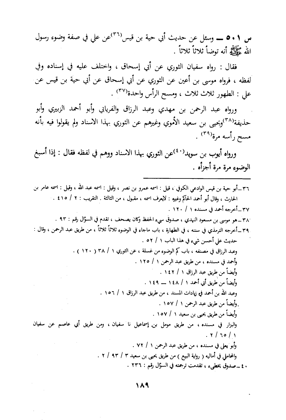 501- وَسُئِلَ عَنْ حَدِيثِ أَبِي حَيَّةَ بْنِ قَيْسٍ، عن علي؛ في صفة وضوء رَسُولِ اللَّهِ صَلَّى اللَّهُ عَلَيْهِ وَسَلَّمَ، أَنَّهُ تَوَضَّأَ ثَلَاثًا ثَلَاثًا.