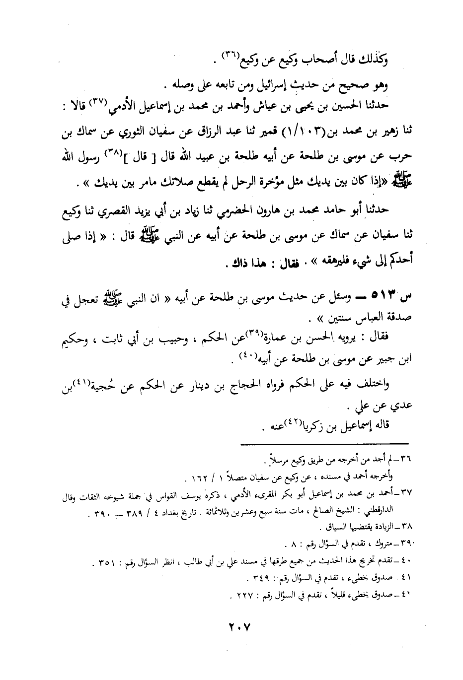 513- وَسُئِلَ عَنْ حَدِيثِ مُوسَى بْنِ طَلْحَةَ، عَنْ أَبِيهِ أَنَّ النَّبِيَّ صَلَّى اللَّهُ عَلَيْهِ وسلم تَعَجَّلَ فِي صَدَقَةِ الْعَبَّاسِ سَنَتَيْنِ.