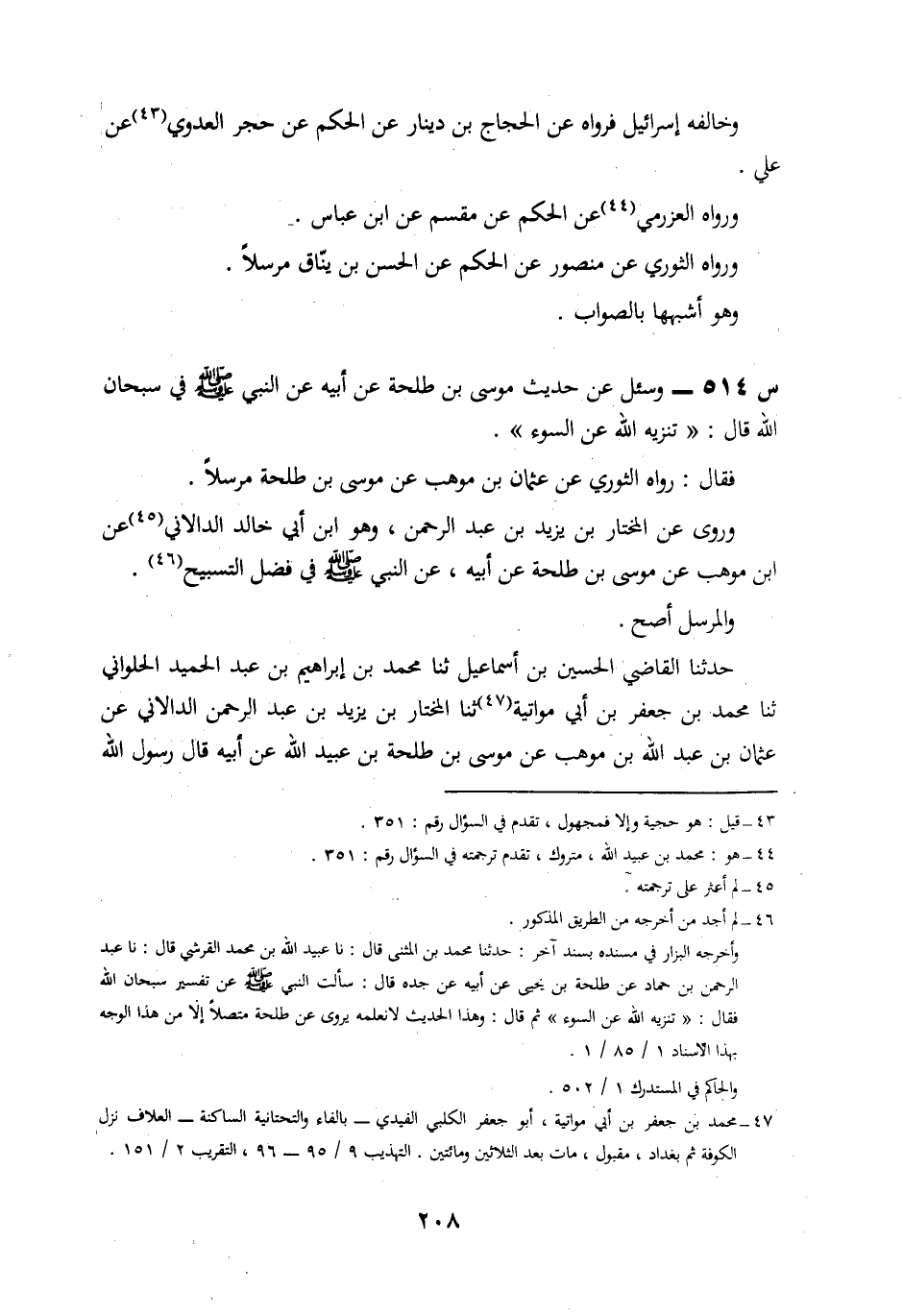 514- وَسُئِلَ عَنْ حَدِيثِ مُوسَى بْنِ طَلْحَةَ، عَنْ أَبِيهِ، عَنِ النَّبِيِّ صَلَّى اللَّهُ عَلَيْهِ وسلم، فِي سُبْحَانَ اللَّهِ، قَالَ: تَنْزِيهُ اللَّهِ عَنِ السُّوءِ.